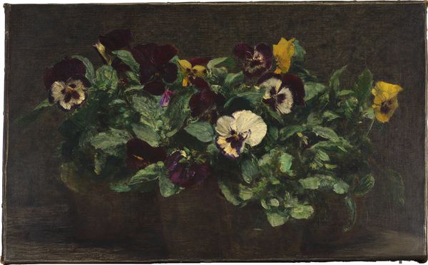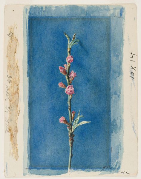 Editor: This is Helen Allingham's watercolor, "Hollyhocks." The deep burgundy blooms really stand out against that murky backdrop. What do you see in the formal qualities of this piece? Curator: The composition pivots on a central vertical axis, established by the plant itself, creating a structured, almost architectural feel despite the organic subject matter. Notice how the artist utilizes a limited palette, focusing on tonal variations rather than a broad spectrum of hues. Editor: It almost feels like the flower is emerging from the darkness. Curator: Precisely. Consider how the texture of the background contrasts with the smoother rendering of the petals. It accentuates the tangible quality of the flower, doesn't it? A masterful manipulation of form and material. Editor: I never noticed how such a simple image can have so much going on! Curator: It is these subtle nuances of technique that speak volumes.