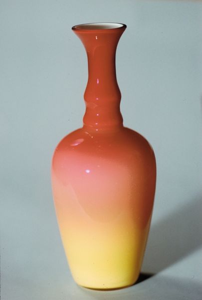 Lino Tagliapietra's "Maracaibo" presents us with a visually striking form in glass, dominated by a warm caramel hue. The sculpture's silhouette is essentially ovoid, pinched at the top and bottom, with a horizontal band bisecting its girth. This band, in contrast to the smoothness of the upper and lower portions, exhibits a corrugated texture, offering a tactile variation that invites closer inspection. Tagliapietra masterfully employs the intrinsic properties of glass—its translucency and capacity for capturing light—to create an interplay of visual weights. The smooth surfaces reflect light in sweeping curves, accentuating the form's curvature, while the textured band scatters light, adding complexity and visual interest. The artist's approach destabilizes conventional notions of symmetry and expectation. The clean lines and geometric simplicity of the design hint at minimalist aesthetics, yet the hand-worked texture introduces an element of organic imperfection. This push and pull between the mechanical and the organic, the perfect and the flawed, generates a dynamic tension, inviting us to reconsider our preconceived notions of beauty and form.