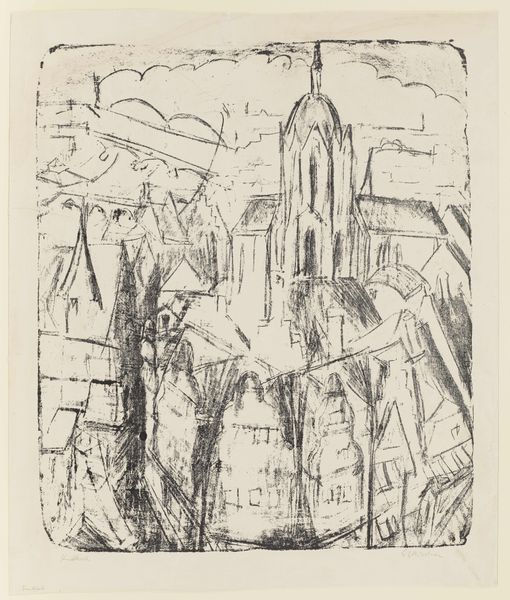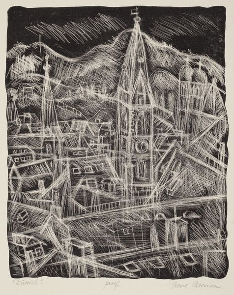 Jolán Gross-Bettelheim made this print, Russian Church Towers, using etching, a process that’s all about controlled mark-making. It’s a dance between intention and accident. Looking closely, you can almost feel the scratch of the needle across the plate. It’s all about tonal variation, with layers of line creating areas of shadow and depth. The ink catches in the etched lines, giving the print a velvety texture. See the way the artist renders the onion domes, they’re not just shapes, they’re built up from these tiny, energetic marks. The cross-hatching gives the impression of form and light. It's an architecture of lines and shadows. I can see echoes of German Expressionist printmaking, like Beckmann, in the intense, graphic quality. There's also something of the utopian vision of early constructivism, in its exploration of architectural form. Ultimately, it's a testament to the power of printmaking, the way a simple line can evoke so much.