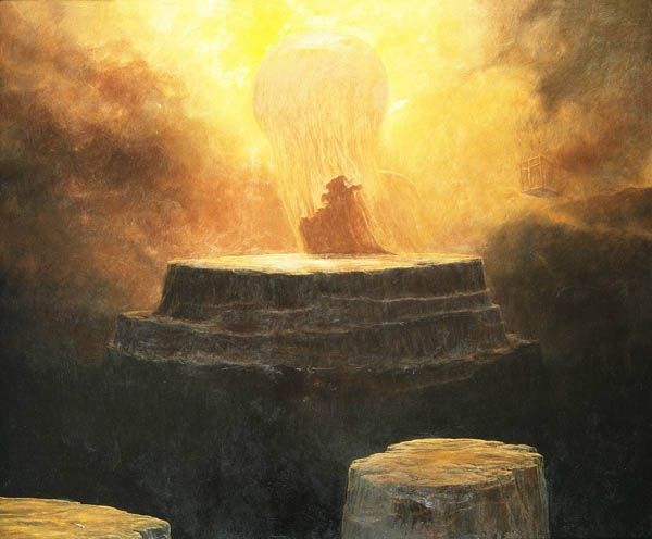 Theodor Severin Kittelsen created "Soria Moria Slott," with watercolor and pencil on paper. The picture space is divided into three horizontal registers. A mass of trolls populates the dark foreground in contrast to the gold castle rising above the flat horizon line, with a cloudy blue sky at the top. Kittelsen’s precise execution with line and color creates a stark contrast between light and shadow, order and chaos. We can interpret this as the opposition between the familiar world of the trolls and the sublime promise of the castle in the background. The golden shimmer invites us into a fairytale vision that seems to promise some sort of transcendence, while the trolls are left behind in the lower depths. But Kittelsen destabilizes this reading by using his meticulous drawing technique to depict the crude, unrefined features of the trolls, which makes them seem more ‘real’ than the castle in the distance. Ultimately, "Soria Moria Slott" does not resolve this duality, as the meaning is always deferred to the other place, the promised, unreachable castle.