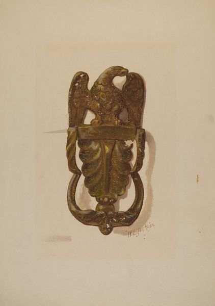 Curator: This intriguing coloured pencil drawing, "Door Knocker," created by William L. Antrim around 1936, features a rather imposing eagle perched above the knocker itself. It’s a wonderfully precise rendering, isn’t it? Editor: Yes, my initial impression is one of stark, almost aggressive stateliness. That eagle looks more like a heraldic symbol of power than a simple house fixture. It certainly sends a message. Curator: Absolutely, and I think that's deliberate. The image of an eagle, of course, carries so much weight culturally. Even in the 1930s, think about how national identity was being visually constructed. To put it on your door knocker... Editor: It becomes a statement, declaring something about the homeowner's values and perhaps even political leanings. I’m curious, how might the context of the 1930s shape the reception of such imagery, especially considering the rise of nationalism across Europe? Curator: Well, on one level, the use of the eagle evokes Roman imperial power through its revival in Napoleon’s emblems and subsequent use in nations that drew upon that symbolism. In America, this references something about both classical values and national symbolism. It might suggest a kind of civic virtue... Or perhaps aspirational identity? Editor: Perhaps, though there's also the inherent potential for the image to be read in a more sinister light. Considering the looming shadow of war, an aggressive national symbol might carry unintended connotations, no? It does invite some discomfort. Curator: Precisely, and this highlights how objects like this door knocker can become battlegrounds of meaning. A homeowner might intend it as a sign of patriotism, but it could easily be interpreted differently, particularly as anxieties about political identity intensified during this period. It's a really resonant piece. Editor: Indeed, looking at Antrim's detailed technique, capturing the light reflecting off what seems like burnished metal, further accentuates the air of significance around what would otherwise be a utilitarian object. It elevates the everyday into a pronouncement. Thank you. Curator: My pleasure. It really goes to show, doesn't it, how something as seemingly mundane as a door knocker can reflect wider cultural and political currents of the time.