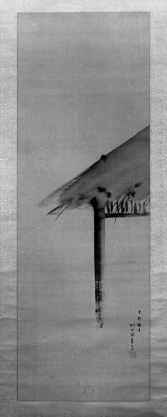 Curator: Before us hangs "Small Bird on Reed," an ink drawing attributed to Kano Naonobu, a work likely created sometime between 1607 and 1650. Editor: There's a poignant stillness to this, a lonely sort of grace. Curator: The composition is remarkably spare, wouldn't you agree? Naonobu masterfully uses empty space. Look at the small bird, perched delicately on the slender reed— the lines so economical, so sure. It makes you consider emptiness, fullness, and silence. Editor: It's almost Zen in its austerity. The single, slightly off-center bird against that expanse of nothingness amplifies a feeling of…vulnerability? That frail creature seems so exposed against such a void. Curator: Absolutely. It embodies a Japanese aesthetic valuing subtlety and suggestion over explicit representation. The varying shades of ink create depth and texture with a surprising visual richness. What do you think that large shape underneath could signify? It seems bulbous... almost otherworldly. Editor: I suspect it could be lotus leaves and buds— common East Asian iconography that represents purity, spiritual awakening. Considering it alongside the fragile bird it heightens this feeling of contemplation. A very peaceful statement about impermanence and beauty. Curator: The artist encourages us to slow down, to observe the ephemeral nature of things. It’s as if the artwork itself is a quiet meditation, a breath held on paper. A very insightful reading, it’s interesting to consider Naonobu's intention alongside the physical artwork. It begs me to think about materiality - what kind of paper, brushes or ink were used here and the way they may have been adapted over the centuries! Editor: Indeed, that play between intention and observation—between form and emptiness—is powerful here, isn’t it? It reminds us of how art can function as both mirror and window, inviting introspection while also revealing something about the world outside ourselves.