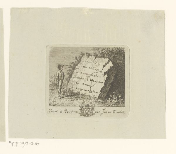 Editor: Charles Meryon’s etching from 1863, titled "Rebus: Béranger was not really strong, for he never had the key to the fields", really strikes me as odd. It’s like a visual puzzle with all these strange images stacked on top of each other. How do you interpret this work, especially with its seemingly random symbolism? Curator: It's definitely a puzzle! Meryon was fascinated by rebuses—visual wordplay. This print isn't just a collection of random images, it's a coded commentary. The bird at the top could signify freedom or perhaps a messenger, setting the stage for the symbolic narrative that follows. Think of how specific images carried weight during this period. Editor: So each picture stands for a word or idea, and together they form a statement? Like a secret message in plain sight? Curator: Exactly. The fort, with "Fate des Boulangers" inscribed inside, evokes notions of destiny and sustenance. What might the image of a barrel evoke? It is labeled ‘espoir’ and ‘salaison’…Hope and Salting? Editor: Maybe preserving hope during hardship? The ‘salaison’ part definitely hints at preservation…and hardship perhaps? Curator: Precisely. These images collectively comment on Béranger’s perceived weakness, utilizing common cultural symbols to subtly critique his strength. Consider also Meryon’s attraction to Romanticism and Symbolism; do you find elements that resonate with these art movements here? Editor: The landscape feels Romantic, but the rebus itself is purely symbolic, like a riddle waiting to be solved, the strange imagery evokes certain psychological responses for me and now understanding its possible purpose unlocks a completely new perspective to the work! Curator: Seeing how visual elements create meaning and continuity within a culture gives a deep sense of place and time. Editor: I'll never look at seemingly random images the same way again!