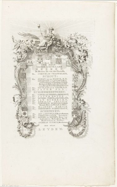Editor: This is "Opdracht in omlijsting met wapenschilden," or "Commission in Frame with Coats of Arms," an engraving from 1739. The artist is unknown. It's quite ornate, with lots of small details packed into a formal-looking structure. It seems very much of its time, and a bit… distant to modern eyes. What draws your eye when you look at it? Curator: Immediately, I see a deliberate attempt to construct a lasting symbolic record. The coats of arms, of course, are visual shorthands for family lineage, power, and social standing. It's not just a list of names; it's a carefully curated presentation of identity through heraldic emblems. Note the frame itself: the architectural details evoke permanence, don't they? Editor: Yes, it really does seem like it was intended to last. The names almost feel secondary to the frame and crests. Curator: Precisely. The arrangement underscores that these individuals derive significance from their families and roles, suggesting a culture deeply invested in maintaining historical memory and continuity. What emotional reaction do the figures at the bottom evoke? Do they seem celebratory? Mournful? Editor: I think they are trying to give off a solemn sense of authority, but they look oddly detached. A bit lifeless even. Curator: Interesting. Consider the role of printmaking at the time. Prints served as a means of disseminating information and solidifying cultural values. Is this commission meant to simply record an event or also to actively shape perceptions? Editor: I think you’re right, there's a real attempt to portray these people and families in a specific way. It's more than just a list. It’s designed to create a specific impression of history and status. I'm seeing a lot more now than I did initially. Curator: Indeed, it’s fascinating how an image can be so explicitly declarative while also containing subtle layers of meaning, speaking to the social and cultural values of its time.