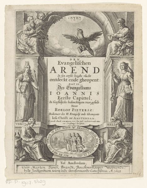 Curator: This elaborate engraving, dating to 1716, is titled "Drukkersmerk van Johan Arnold Langerak in sieromlijsting," or "Printer's Mark of Johan Arnold Langerak in Decorative Border." Editor: It's an eye-catcher, isn’t it? Immediately strikes me as both regal and…busy. Almost feels like they wanted to cram as much symbolism as possible onto one page. Curator: You're right; the Baroque period loved ornamentation. As a printer's mark, it was crucial for Langerak to signal his brand, values, and trustworthiness. We see imagery associated with legal and academic authority. Editor: Legal authority, that's exactly it. The central text block resembles an official document, very authoritative. But the bottom vignette... what's the story there? Curator: Ah, a visual allegory. It features a figure of Roma, helmeted, and bestowing a laurel wreath – recognition, honour – upon a kneeling man. Fame, symbolized by an angel, also joins. It encapsulates the ambition of academic pursuits. Editor: Clever way to elevate what is, essentially, an advertisement. It’s more than just ink on paper; it's an aspirational statement. The border, a mix of weaponry and laurel wreaths, adds to that sense of prestige, right? Curator: Absolutely. Those crossed quills and other academic objects signify intellectual labor, suggesting legitimacy. The printer is associating himself with these powerful images, imbuing his publications with their associated prestige. It also signals Langerak's allegiance to particular scholarly and cultural values. Editor: It's fascinating how a single print can communicate so much about the ambitions of the artist—and, in this case, the printer—and the cultural climate of the time. I see a powerful performance in this one image. Curator: Exactly. Looking closer at historical works like this one can provide a better grasp of past societies and beliefs than many textbooks combined. Editor: Yes, art is definitely always speaking, if you're willing to listen. It is all storytelling, ultimately.