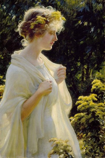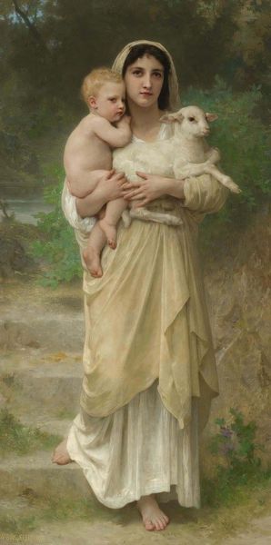 Editor: This is William Bouguereau's "L'Attente," painted in 1901 with oil. The woman's serene expression, juxtaposed with the implied waiting, makes me wonder what narrative Bouguereau is trying to construct. What strikes you about this piece? Curator: What stands out to me is the context of academic art in the late 19th and early 20th centuries. Bouguereau, a celebrated figure in his time, championed classical ideals and technical virtuosity against the rising tides of modernism. He sought to maintain the traditions of the salon system in France, exhibiting frequently at the Paris Salon and adhering to its expectations regarding subject matter and style. This woman in "L'Attente" aligns perfectly with academic art. Considering the historical context, what message do you think it sends by using an idealized portrayal of feminine beauty rooted in classical art? Editor: Perhaps a resistance to the changing art world? Was he intentionally turning his back on Impressionism and other movements? Curator: Precisely. It's a conscious assertion of established values in the face of a changing socio-political landscape. The salons were cultural gatekeepers, so the paintings that appeared there affirmed certain views of society. Notice how the female figure evokes Renaissance depictions of Venus or nymphs. In what ways might the classical imagery contribute to or challenge the representation of women during that period? Editor: It's almost like a fantasy—a timeless representation, far removed from the realities of women's lives at the turn of the century. It makes me wonder if the focus was less on genuine depiction and more about reaffirming ideals. Curator: Yes, but it's crucial to remember this was a period of significant social change for women. So by embracing classical art, the politics of imagery became a stage to play with the societal position of women. In any case, I feel my understanding of "L'Attente" deepened as we looked into it through a cultural and historical lens. Editor: Mine too. Thanks! I appreciate learning to see this artwork through the lens of cultural institutions and historical shifts.