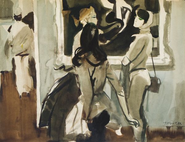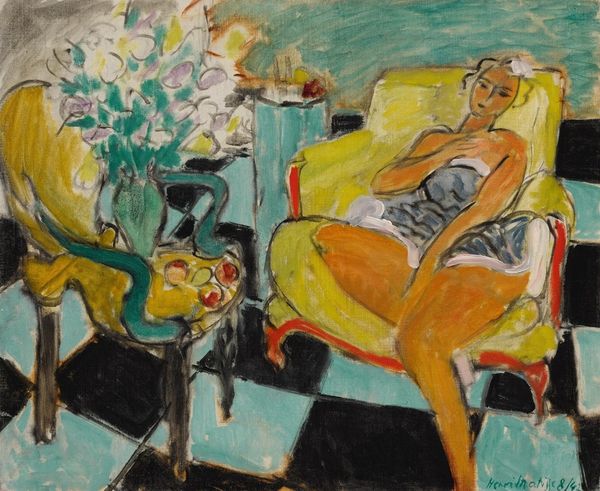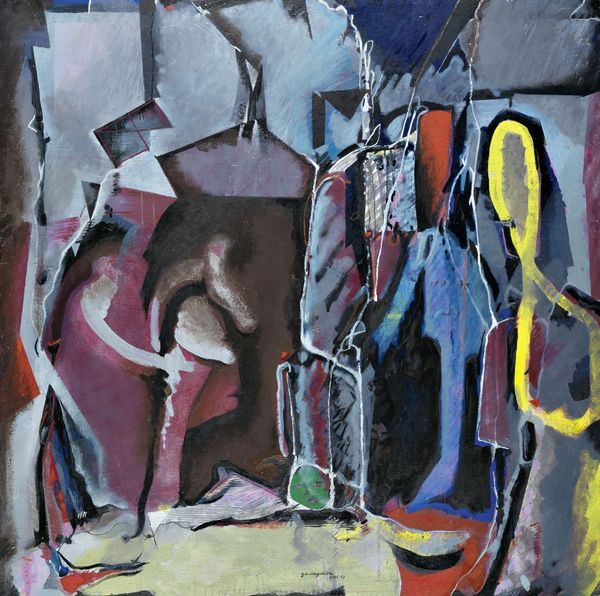 Curator: Welcome. Before us is Edvard Weie's "Standing Female Nude," an oil on canvas from 1923, currently held at the SMK, the National Gallery of Denmark. Editor: Well, it strikes me as a very raw depiction, almost unfinished, yet strangely powerful. The colors are muted but create an undeniable energy. Curator: Precisely. Weie's Expressionist style shines through in the loose brushstrokes and the distortion of form. The planes of color dissect the figure, fragmenting her into geometric shapes. Observe the interplay between the ochre background and the cool blues and greens used to model her form. Editor: And those thick daubs of paint! It really emphasizes the physical act of creation, doesn't it? You can practically feel the artist's hand moving across the canvas. It makes you think about where Weie was painting, how the room influenced the work...I also note that canvas looks heavily primed with oil paint which had to take ages to prepare. Curator: Absolutely, the materiality of the paint is critical. Weie was deeply invested in the structural elements of painting – line, color, and composition – and used them to explore the possibilities of representation. His underpainting is fairly noticeable too, that’s a lot of building! Consider the spatial arrangement. The nude is set against what seems to be a deliberately ambiguous interior setting with only the basics present: her easel, the set of colours of the background. Editor: I appreciate your perspective, but seeing the supplies within this painting of the artist reminds me of their struggle. They were ostracized, facing great economic constraints. Did that also shape their decision-making when it came to paint and how lavish to be with those supplies? What even are the exact pigments that make up those thick swirls? Curator: His life experiences undeniably influenced his artistic practice. However, here, I am most intrigued by the construction of the figure. Weie is not striving for realism but for a psychological exploration of form and presence, how even muted tonality communicates its form and depth, particularly around the left-most breast and upper abdominal area. Editor: I still see the studio—the reality—shaping everything here. It is just so palpable to think of Weie here trying to challenge norms of sexuality. Ultimately, what resonates with me is how he managed to challenge not just how painting had been, but that his choices really convey such palpable meaning, from pigments to priming choices to applying brush strokes to suggest skin-on-bone. Curator: A vital contribution! I feel you brought me much closer to Weie today. Editor: Thanks to you, as well, I understand much more about formalism and Weie’s unique place within that canon.