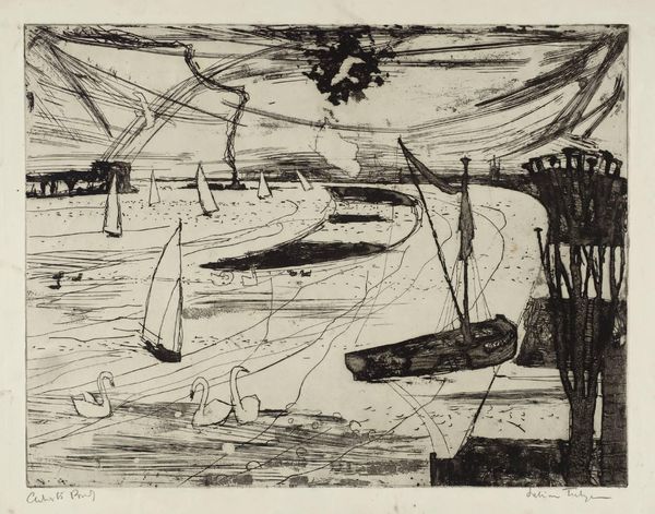 Editor: Worden Day's 1948 print, "Runic Traces", rendered as a linocut or woodblock print, intrigues me with its somewhat obscured images. The arrangement of abstracted objects layered on top of each other conjures thoughts of the artist searching for a way to document their world, not necessarily replicate what it looked like. What is your take? Curator: It feels like archaeology, doesn't it? Layers upon layers hinting at half-forgotten forms and the stories they might tell. Look closely at the forms she repeats. What could these "runes" be evoking, do you think? Is she simply constructing an image, or could there be some hidden symbolism? Editor: I see a lot of shapes and patterns, especially angular and straight lines. I do think the name "Runic Traces" nudges me to interpret these marks as meaningful writing even though I don't understand it. Do you think it could be that abstraction serves as a new kind of symbolic writing in the modern era? Curator: Perhaps. Or maybe it’s an attempt to access a more primitive form of communication, something older and more universal than written language. What is your feeling on the color choices, or lack thereof? Editor: That's interesting! It seems more accessible since the lack of many colors allows you to not be overwhelmed. The earth-toned color palette gives it that sense of unearthed discovery as if its fadedness is evidence of its antiquity. The more I consider your points, the more "Runic Traces" appears to show us what humans have left behind rather than what they will achieve. Curator: Exactly! Through symbolic echoes, Worden Day transports us across millennia to ponder the persistence and the mystery of our shared visual language. Editor: What an incredible consideration! I’ve gained a greater understanding of how our historical memory influences abstract modern artwork, encouraging each of us to translate and build narratives that fit our perspective.