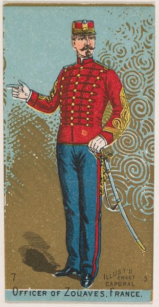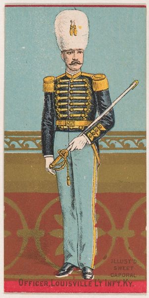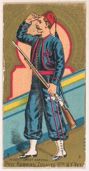Editor: So, this color lithograph, "Private, Louisville Light Infantry, Kentucky," dating from 1888, was produced by the Kinney Tobacco Company as a promotional item. The palette feels unexpectedly pastel. What's your read on this print? Curator: Well, let's consider the context: tobacco cards were mass-produced, ephemeral objects, not fine art in the traditional sense. The choice of drawing and print as a medium points directly to that mass consumption. The chromolithography process itself, which enabled inexpensive color printing, is key. What labor went into the image creation and how it speaks to industrial progress? Editor: Interesting! I hadn't considered the industrial aspect. So, the very fact that it's a print meant to be disposable shapes its meaning? Curator: Absolutely! Think about the distribution—inserted into cigarette packs. It’s advertising, plain and simple. Consider what kind of message it's sending to consumers by depicting this soldier. Editor: It's glorifying military service and associating it with…smoking? I guess that would normalize tobacco usage by associating it with values like strength. Curator: Exactly! It speaks volumes about late 19th-century consumer culture and how companies manufactured desire and ideals through mass-produced imagery. Who benefits? What social and cultural ideas does it perpetuate? The value lies less in the aesthetic and more in understanding how these materials shaped perceptions. Editor: That really shifts my understanding of the image. It’s less about the individual soldier and more about the entire system of production, distribution, and consumption. Curator: Precisely. We must look at who made it, how it was made, and what purpose it served in the broader social and economic landscape.