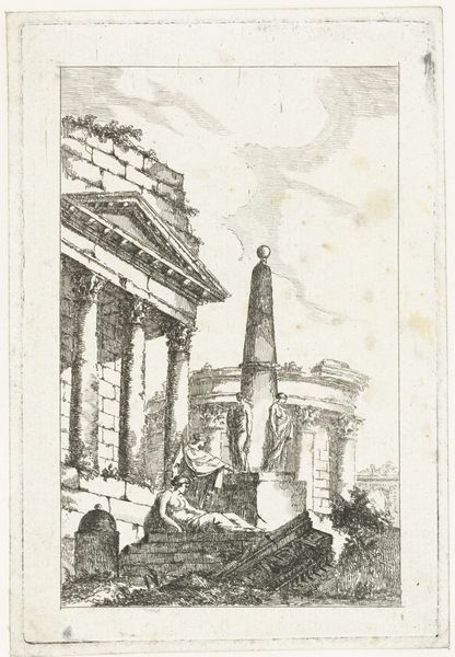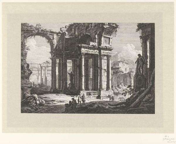 Editor: Here we have Bellicard's "Architectural Capriccio," likely created sometime between 1745 and 1780. It's an etching, and evokes such a melancholic, romantic feeling, I think. What do you see when you look at this print? Curator: The ruins speak volumes, don’t they? We see these fragmented forms—the arch, the columns—stripped bare, not just of their original ornamentation, but of their initial purpose. How does that affect you, seeing the symbols of power rendered so fragile? Editor: It makes me think about the impermanence of everything. I guess it is like looking at ghosts. But what do these architectural forms symbolize to you, beyond just power? Curator: Ah, that is a good question. The architectural style itself harkens back to antiquity, right? So, Bellicard isn't just showing us ruins; he's showcasing the remnants of an idealized past, of lost empires, of concepts like "utopia" and "permanence" dissolving with time. The capriccio, as a genre, enjoys this dance between reality and fantasy. Notice the light—does it comfort or haunt? Editor: I hadn’t considered the light...it's so faint and diffused. Almost dreamlike. The buildings are decaying but the mind fills them with meaning. Curator: Precisely. And think about how memory works—we piece together fragments to construct a whole narrative. Bellicard gives us those fragments, inviting us to reconstruct, to imbue these ruins with our own emotional and intellectual weight. The image continues its conversation, even as stone decays. What do you think is the psychological weight of ruins, overall? Editor: I'm beginning to see how much more complex this is. It's about history, but also about our own perceptions and interpretations of the past. Thanks, I definitely have a new appreciation for ruins now. Curator: And I'm reminded how potent visual symbols can be across time. Every line etched carries a legacy.