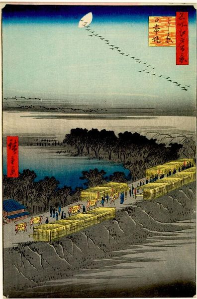 This is Nihon Embankment and Yoshiwara, a woodblock print made by Utagawa Hiroshige in nineteenth-century Japan. The image is composed of multiple blocks of wood, each carved to represent a different color. The process involves applying ink to the surface of these blocks, then pressing them onto paper. This labor-intensive technique highlights the contrast between the flat expanses of color and the fine details. Notice the procession of figures and carts moving along the embankment. The artist skillfully captures the scene through the repetitive, rhythmic patterns of the design, emphasizing the material qualities of the woodblock print, and giving it texture and depth. Hiroshige was part of a well-established tradition, but he brought his sensitivity to the depiction of daily life and landscape. In his work, the traditional distinction between fine art and craft blurs. This print is not just an image, it is a testament to the skill and labor involved in its creation.