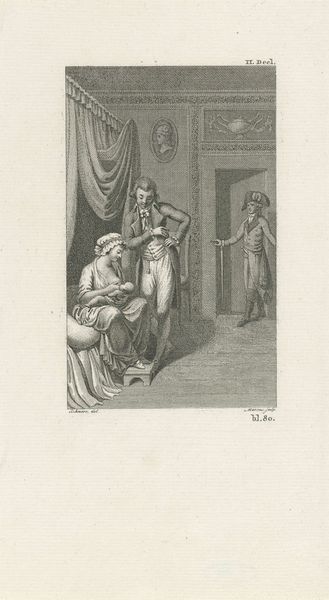 Curator: We are looking at "Man on the verge of stabbing another man," an intaglio print made in 1786 by Reinier Vinkeles. It’s a work very much in the Neoclassical style, currently residing here at the Rijksmuseum. Editor: What strikes me immediately is the tension, the precariousness of the moment captured. The sharp angles of the would-be attacker's arm juxtapose violently with the curved forms of the figures he’s attacking, all framed within that meticulously detailed, yet static interior. Curator: Precisely. The scene is a study in controlled passion, if that makes sense. The print reflects the historical context, the rise of reason and order mirrored in artistic form even when depicting violent subject matter. History painting of this era often served to instruct viewers morally, reminding them to shun unlawful behavior. Editor: The figures' gestures also remind me of a stage. Each one of them has a dynamic pose; in particular, I admire how Vinkeles used sharp contrasting lines to show light on their clothing. Notice also how all those directional lines converge to form the potential stabbing location? It’s an ominous focal point. Curator: Yes, the use of classical composition principles is very present here. While we don’t know exactly what the narrative this work represents is, it seems the image may reference ideas around justice. Prints like this also played a role in disseminating political ideologies. They allowed access to art and ideas, especially with their rising distribution at this moment in time. Editor: The controlled nature is indeed the main topic. Even with so much dramatic tension in the composition, with so many converging and opposing vectors, the static quality comes off to me as forced, artificial, similar to theater poses from back then. Curator: Well, in looking at the society that fostered this art and at the values this reflects and promotes, it allows for critical exploration of justice, reason, and control. The narrative—whether familiar or not—invites the audience to think critically about this. Editor: It makes you think that despite all these historical contextual factors, sometimes pure, unadulterated emotion is superior. Thank you for bringing your point of view here, very enlightening! Curator: Thank you, yours was equally enlightening. Analyzing the historical and artistic qualities that make up this work allowed us to think critically about society.