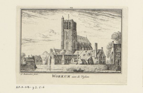 Curator: Jan de Beijer created this pen and ink drawing, titled "Gezicht door de Kerkstraat op de kerk te Workum," sometime between 1713 and 1780. Editor: Oh, this feels so peaceful. The light, airy tones and delicate lines make it almost dreamlike. There's a quiet dignity to this street. Curator: De Beijer was known for his detailed topographical drawings. He documented numerous towns and cities, focusing on architectural accuracy. Think of him as an urban sketcher centuries before the term even existed! His works offer invaluable records of how these places looked. Editor: I'm drawn to the way the church spire punctuates the sky. It feels both monumental and gentle. It anchors the entire scene while these gorgeous buildings with stepped gables lining the streets add to its beauty. It looks so inviting that it is easy to daydream. Curator: Exactly. These depictions of Dutch Golden Age cities, like the one here at Workum, reveal much about civic pride and urban development. This was an era of great prosperity and, as De Beijer's drawing implies, a celebration of place through art. It also reveals a sophisticated understanding of perspective. Editor: I like how he included those figures sitting along the canal, it offers a glimpse of everyday life back then, and lends a human dimension to the otherwise stoic architecture. Were those figures just a way of implying the grand scale of the scenery, or does their inclusion go beyond aesthetics? Curator: Perhaps both. By including these figures, De Beijer demonstrates the buildings' size and illustrates life within the city. Consider also that he was doing this for potential patrons. Think of it as showing off Workum’s beauty but, implicitly, its stability and commercial vibrancy. The pen becomes a tool of subtle civic boosterism. Editor: That makes perfect sense. Knowing the historical motivations changes how I read the image entirely. I now recognize it almost as a tourist promotional pamphlet, showing potential traders that Workum is an active, orderly, safe, and therefore, worthy investment target. Curator: Precisely! And as we leave this lovely rendering, perhaps consider the subtle power of images. How they shape not just our perception but our understanding of the past. Editor: Absolutely! A tranquil pen sketch that unfolds into a lesson in history and urban dynamics—who could ask for more?