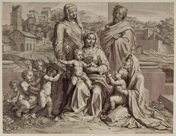 Editor: We're looking at "Holy Family (with Elizabeth and Saint John)" by François de Poilly the Elder. It’s quite a stately print. What strikes me is how everyone seems caught in a moment of quiet contemplation. What do you see in it? Curator: It makes me think about how families gather, generations overlapping, each offering a different kind of support. The print feels like a tapestry of gazes, doesn't it? Joseph is watching, Elizabeth is guiding, and Mary... she's holding the future. Does that resonate with you? Editor: It does! There's a sense of history and legacy woven in. Curator: Exactly! And even outside of religious context, isn't it a potent image of familial love, guidance, and the passing on of wisdom?