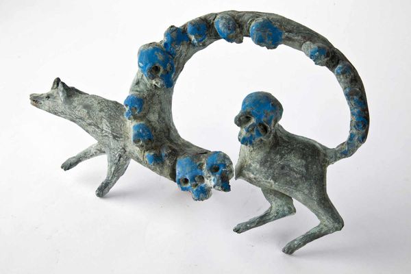 Here we see an untitled sculpture by Enzo Cucchi, of indeterminate date, comprised of metal with applied pigment. The sculpture presents a figure, seemingly suspended horizontally. The work's patinated green and yellow palette is contrasted by a rough, porous texture, which may evoke feelings of age and decay. Cucchi seems to be investigating the interplay between form and abstraction, where the recognizable human figure meets organic abstraction. Cucchi's approach invites us to consider the artwork as a symbol and sign. The horizontal figure can be interpreted as a figure in repose, a classical motif that may reflect the artist’s interest in historical narratives and their modern reiteration. The bright yellow pigment is a powerful, expressive visual element that contrasts with the oxidised green surface to draw the eye and invite contemplation on materiality, form, and the conceptual significance of the work. The convergence of these elements in this intriguing sculpture underscores art’s capacity to destabilize conventional meanings and promote interpretive thought.