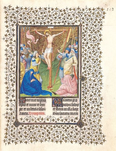 Editor: This is "The Coronation of the Virgin, from a Book of Hours," made sometime between 1460 and 1470 by Willem Vrelant. It looks like it's tempera, watercolor, and ink on vellum. What strikes me is the way the gold leaf halos and trim stand out against the blue and rose robes. What do you see in this piece? Curator: Indeed. I see a highly structured composition, where the figures are carefully arranged within the confines of the miniature. The verticality of the architectural elements—the throne, the implied cathedral arches—counters the implied horizontality of the earthly plane on which Mary kneels, all emphasizing the divine ascent. Note the precise rendering of the drapery; it’s not merely decorative but structural, defining volume and directing the eye. Editor: So, it's more than just pretty; you're saying that everything has a purpose in leading your eye? Curator: Precisely. And consider the color. The ultramarine of Mary’s robe, the rose of Christ’s mantle, and the gold—these aren’t just aesthetically pleasing choices. They are, structurally, focal points. Ultramarine, derived from lapis lazuli, was extraordinarily expensive, thereby immediately designating her as a central figure within the composition. And note the distribution of white across the frame, another strategy for distributing balance across the picture plane. Editor: That makes me appreciate how the colors and shapes work together. Anything else to think about? Curator: Consider also the implied lines – where do they converge, and what do they signify structurally? What shapes recur, and to what effect? Close visual analysis is the key to decoding the intentionality behind every formal decision. Editor: So much more than meets the eye at first glance. I'll definitely pay closer attention to composition going forward! Curator: A worthwhile endeavor. It’s in this detailed visual interrogation that true understanding resides.