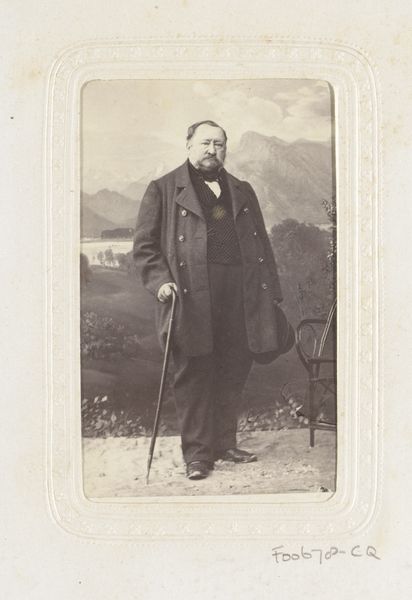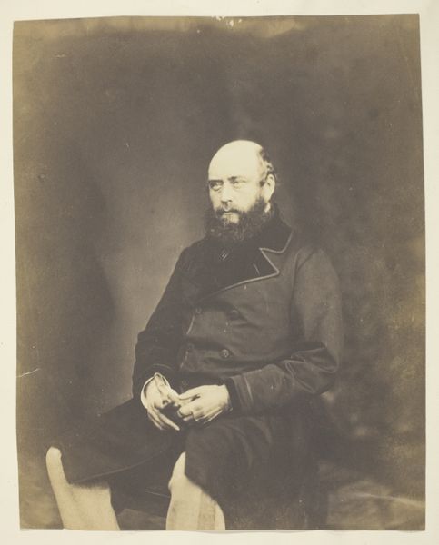 Editor: This is a photograph of Pierre-Joseph Proudhon, taken in 1865 by Felix Nadar. It’s a gelatin-silver print, and the sepia tone gives it such an antique, almost weighty feel. I notice the composition—how the subject occupies a generous amount of the frame, but is almost enveloped by shadow, despite being indoors. What do you see in this piece? Curator: I see an exploration of chiaroscuro that prefigures modernist approaches to portraiture. Observe the almost theatrical way light interacts with the textures. The fringe detail on the chair provides an important textural counterpoint to Proudhon's beard and the materiality of his jacket. It’s all about contrasting the hard with the soft, the light with the dark. Nadar has created not just a likeness, but a carefully orchestrated study in contrasts. Editor: That's fascinating! So it's more about the formal elements at play than, say, what Proudhon might have been thinking or feeling? Curator: Precisely. We are analyzing the art itself and its forms. The tonality is remarkably subtle given the age of the print, but note how that subtle grading serves to articulate depth within the frame, pulling our eye in. Editor: So, in a way, the composition becomes a statement in itself? It isn't just a historical record. Curator: Indeed. Consider the strategic arrangement of shapes—the rounded form of the sitter echoes in the armrests. Notice Nadar almost lets the highlights disappear. Formally, there’s a complex relationship between revealing and concealing, and this tension shapes our experience of the piece. Editor: That definitely gives me a new perspective to appreciate how visual elements in this seemingly simple photograph are powerful. Thanks for sharing. Curator: My pleasure. Looking closely helps us unlock so much.