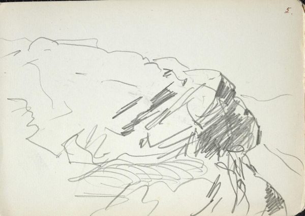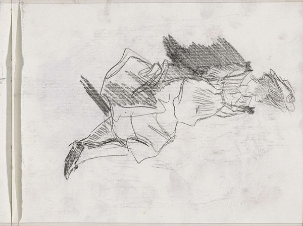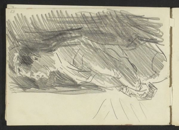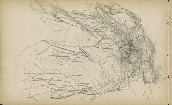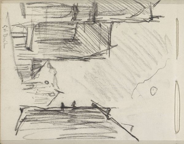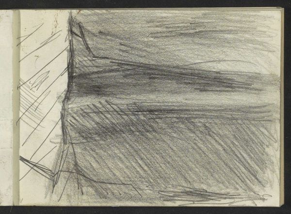 Curator: This drawing, done with pencil, is titled "Studie, mogelijk van een theatergordijn en een stellage," which translates to "Study, possibly of a theater curtain and scaffolding" by Isaac Israels, and it's part of the Rijksmuseum collection, created sometime between 1875 and 1934. Editor: My immediate response is the contrast. A dark mass looming above more defined, angular shapes. It feels incomplete, or rather, a fragment of something larger. Curator: That sense of incompleteness echoes the drawing’s status as a study, doesn't it? Note how Israels, though associated with Impressionism, offers something bordering on abstraction here. Editor: Abstraction emerges so beautifully when process is evident. The hasty strokes, the layering of graphite, reveal the artist grappling with form, light, space...almost performing labor. Curator: Yes, and what's fascinating is the potential subject matter: a theatre curtain and scaffolding. These themselves are liminal objects, temporary structures used to create illusion, or rather, artifice. What feelings do you think they elicit from us as signs? Editor: Interesting connection to artifice. The curtain as artifice, concealing, revealing...It implies performance, perhaps spectacle. The scaffolding on the other hand signifies something provisional and functional. It is humble and exposes construction as labor. Their pairing, staged this way, exposes some tension... Curator: Exactly! Israels presents us not with a polished performance, but with the behind-the-scenes mechanics. There's a vulnerability in that rawness. He gives the suggestion that he also finds the tension of making and production, but rather he embraces this stage in the artwork. Editor: Thinking about it more, perhaps that tension points toward broader societal shifts. Industrialization and the changing role of art. Scaffolding always implied physical labour that in an industrialized world is easily covered over... Curator: And that is very different from the "glamour" presented in the theater, a place of class performance...It exposes our contemporary sense-making. It feels especially timely now as labor issues, class issues become more visible within society. Editor: Precisely! It's easy to see a direct, unromantic engagement with labour here, something usually rendered invisible. And of course all that only gets captured through such material handling of pencil. It invites me to re-evaluate so many stage and glamour discourses within culture at large... Curator: It certainly makes us reflect, as well, about all the unseen effort behind the things we consume or the stages that appear seamless to us on surface. Thank you for the insight. Editor: And thank you, I will not see a theatre piece in the same way.
