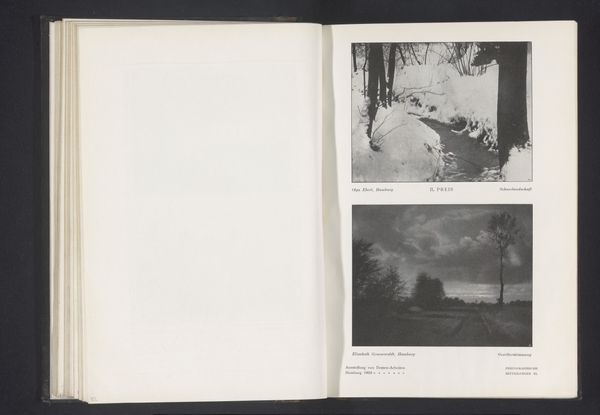 This is a print by A. Thiriat, titled "Acht gezichten op het meer van Longemer", or "Eight Views of Lake Longemer," a black and white image printed on a page that is part of a book. The page is split in two with one side blank, the other containing eight views, each framed differently—squares and a circle—and angled on the page. It is this arrangement that suggests a semiotic system at work. The lake becomes a signifier, its meaning altered by each framing. The formal composition destabilizes any fixed reading. The structure suggests we reconsider how we look at and understand a landscape when it is presented in fragmented views. Consider how the shifting perspectives might deconstruct conventional landscape art by challenging the idea of a single, coherent viewpoint. These visual strategies serve not only aesthetic purposes but also engage with larger philosophical questions about perception and representation.