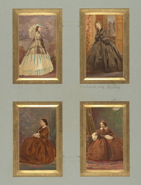 Editor: Here we have "Untitled" a photo album page with various portraits by Mary Georgiana Caroline Cecil Filmer. The arrangement of these portraits is interesting. What do you see in the composition of this page? Curator: The formal arrangement of these photographic portraits, mounted on the album page, reveals a deliberate aesthetic. Consider the balance of light and shadow across the individual images and the way they interact within the rectangular frame of the page itself. Editor: So it's more about the visual interplay than the people themselves? Curator: Precisely. The texture of the paper, the varying tones of the photographs, and their spatial arrangement contribute to a visual experience independent of their representational content. How does the materiality of the album page influence your perception? Editor: I see it now, like a collage of tones and textures! Thanks. Curator: Indeed, a successful marriage of form and content.