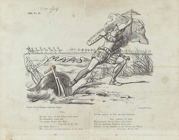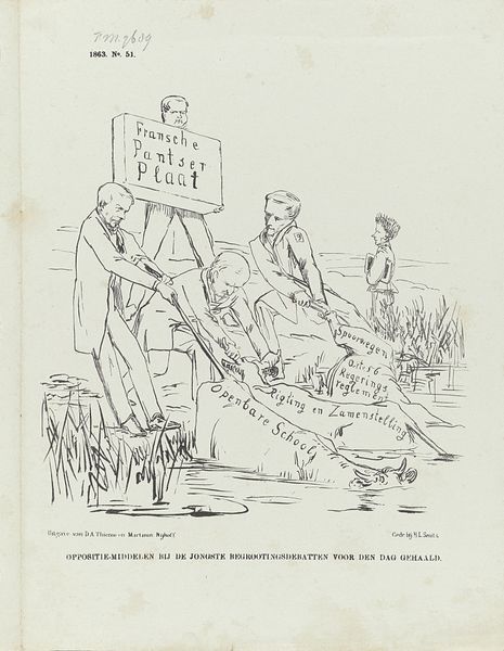 Curator: This drawing, titled "Spotprent op de oppositie tegen het Reglement voor Suriname, 1865," created in 1865 using pen and ink, offers an intriguing lens through which to consider the material realities of power. Editor: I see that. The figure in the walker looks constrained, almost puppet-like. How does this visual representation connect to the actual historical context? Curator: Let’s consider the drawing's function as a mode of production. It's an act of visual commentary using accessible and reproductive materials like pen and ink. The act of circulating such an image can be seen as part of a broader material struggle, a war of images tied to the means of representation. What is being distributed? Ideas. The sitter here being literally confined by a "walker" speaks directly to the limitations being placed upon the Surinamese. This cartoon's simple material production and means of distribution are designed for maximum persuasion. The mode of creating such a drawing, how might this be similar to forms of protest during that time? Editor: That’s interesting. The deliberate simplicity of the materials—pen and ink—makes it easily reproducible. You’re saying the cheapness allows it to function almost as propaganda? Curator: Precisely! The material limitations are also what make it powerful, no? Look at the rough line work, and its accessibility. If the image were more 'refined' do you believe its political aims would be as direct, and affecting? The intent of these "folk" sketches serve as direct and sometimes effective resistance to hegemonic cultural narratives, through labor of its very crafting. What more does its content betray in your opinion? Editor: Now that I think of the drawing in terms of labor and distribution of political opinions, its form appears much more active, less of a passive reflection, and more a means of intervening in a social debate. Curator: Indeed. By understanding how this image was made and circulated, we can better understand its place in the broader context of power dynamics and resistance, where tools and forms such as caricature became materials. Editor: It’s amazing how shifting the focus to the material production changes the interpretation of the artwork. Curator: Exactly. Focusing on the artistic practice reminds us that creating and consuming such material objects were actions that played a role in historical struggles.