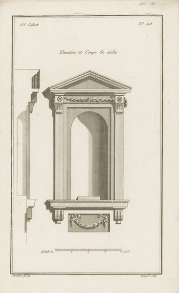 Editor: Here we have Johann Carl Schleich’s "Preekstoel met de stenen tafelen," created around 1780. It's a print, an engraving, a drawing really showing architectural design. There’s such starkness to the line work; it feels very calculated and precise. What’s your take? Curator: This piece exemplifies Neoclassical interests, yes, but what grabs me is how Schleich treats architecture less as divine inspiration and more as crafted output. Look at the precise lines of the engraving – this level of detail emphasizes the *making* of this religious architecture. It spotlights the manual labor involved in translating grand designs into tangible forms. Editor: So, you’re less focused on the symbolism, and more on... the means of production? Curator: Precisely. Where did Schleich source his materials? Who trained him in these techniques of engraving? The labor informs the structure of religious expression here. Think of it this way – these designs reflect the power and patronage required to commission and realize them, not simply divine will. What’s the material reality behind this artistic rendering? Editor: That's interesting. I was stuck on interpreting the religious symbolism but you're pushing me to consider what this print reveals about 18th-century craft and production. Curator: It moves beyond individual expression, doesn't it? This print isn't just a representation; it’s a document reflecting broader economic and social practices inherent in the art making and distribution of art objects like architectural designs. It helps to contextualize the physical spaces that followed. Editor: I never thought about it like that. Thanks! It reframes how I see not just this print, but architecture in general, as reflecting processes beyond the architect's vision. Curator: Indeed! It prompts us to question: what else remains unsaid, yet visibly present, in its materiality?