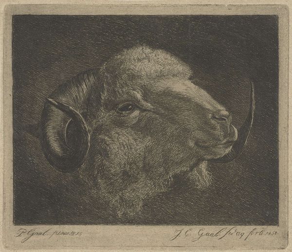 Editor: Here we have Jacobus Cornelis Gaal's "Head of a Ram with Horn Curving Towards the Eye", made around 1855, using graphite and pencil. It feels quite somber, almost monumental. What do you see in this piece, considering its place in art history? Curator: Well, what strikes me is how the ram’s head, isolated against that dark background, becomes almost iconic. The horn, coiling so tightly towards the eye, becomes a powerful symbol, doesn’t it? Think of the ram across cultures – Aries the Ram representing a new beginning and leadership. Do you see those associations echoed here, or something different? Editor: I suppose I was seeing something more subdued; the dark tones made it feel almost like a memento mori. But I see what you mean about the ram being a symbol. It’s interesting that the horn is obscuring the eye... is there a specific meaning? Curator: It is a fascinating detail, isn’t it? Perhaps the artist intended for the symbolism of new beginnings, and impulsive action, to be read as a cautionary tale; in which case that obscured vision becomes central. It’s an interesting choice to pair strength with a certain blindness. Don't you find it compelling how artists chose specific attributes? Editor: Yes, definitely. I was just focusing on the detail and the rendering itself, but your reading really unlocks the potential symbolism that I initially missed. Thanks. Curator: And thank you for making me look beyond the obvious and consider how tone shapes our initial interpretations of powerful images.