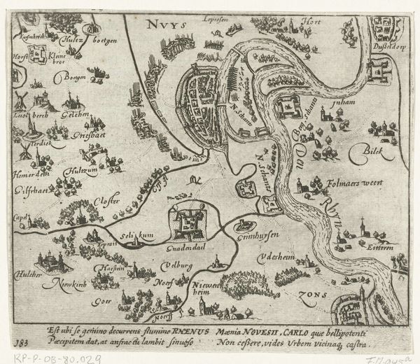 This is an anonymous print of the Siege of Hulst by Archduke Albrecht in 1596. Note how the landscape is meticulously segmented, each plane packed with dense, active lines that delineate fortifications, troop formations, and waterways. The image is dominated by a structured rendering of space where land and military strategy are intertwined. The composition is spatially divided to present a comprehensive view of the siege. Through the strategic arrangement of elements like the star-shaped fortresses and the linear deployment of troops, the artist constructs a visual language that communicates power and control. The systematic representation of space seems to reflect a world-view rooted in order, yet, this very attempt to map and control introduces a level of abstraction. The relentless detail, etched into the print, transforms military action into a tableau of graphic precision. This approach challenges fixed meanings; the print is not just a record of the siege, but a study in the abstraction of conflict through cartographic representation. The image invites us to consider the ways in which events can be reshaped and re-presented through formal structures.