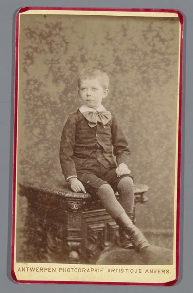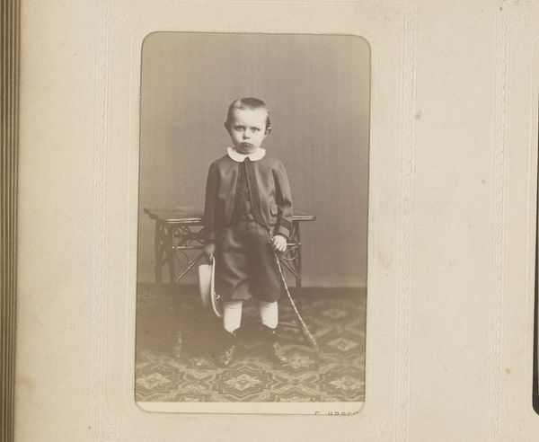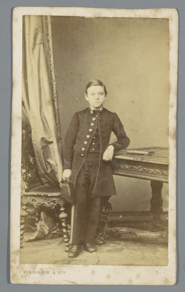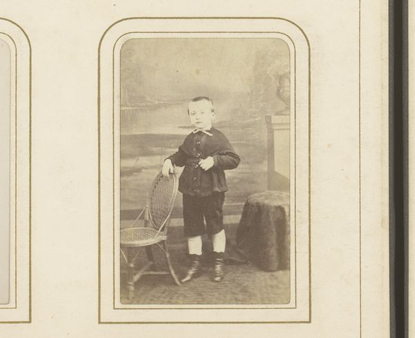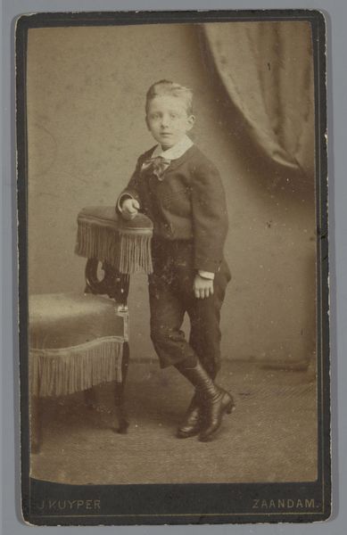 Curator: Here we have a photograph titled "Portret van een jongen, staand bij een stoel met hoed," or "Portrait of a boy, standing by a chair with hat" in English, believed to have been created sometime between 1850 and 1893 by Prosper Bevierre. Editor: It’s evocative, like a tiny, serious general. Look at the stiff posture, the ornate little uniform… I can almost smell the musty scent of a long-closed parlor. Curator: Indeed. Child portraiture became increasingly popular in the mid-19th century, reflecting changing social attitudes towards childhood and family. Photography offered a new way to capture these fleeting moments, reinforcing bourgeois values of domesticity and remembrance. Editor: Remembrance... it feels less like celebrating childhood, and more like embalming it. That chair, almost comically large for him, becomes a throne of expectation. What future was ordained for this child in that rigid stance, captured forever by the photographer’s lens? It makes me wonder what he truly wanted. Curator: And yet, these portraits also served a vital social function. In an era with high mortality rates, particularly amongst children, photographic portraits served as lasting memorials. Photography allowed families to create a tangible link to lost loved ones. Editor: Absolutely. He stares out from sepia-toned edges, challenging time. I see the vulnerability beneath the clothes – the story beneath the pose. It makes you think that even when people try to make portraits serve power or memory, it is humanity peeking through. Curator: Ultimately, the photograph operates on multiple levels: as a memento mori, a status symbol, and as a carefully constructed performance for the camera that we, as modern viewers, can't help but deconstruct and analyze. Editor: So we have these fragments, remnants of something bigger. A moment. And that serious small soldier, his forgotten hat waiting obediently nearby...they make this old image so strangely vivid and moving for me.