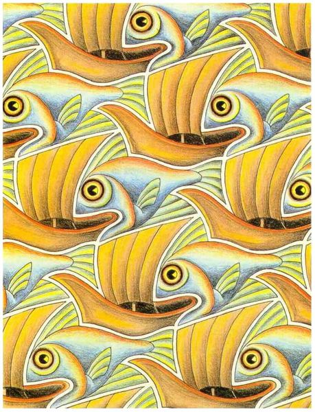 Curator: Looking at this print by M.C. Escher from 1939, "Metamorphosis II excerpt 4," my first thought is, wow, my brain kind of wants to rebel! It's this intricate, shifting dance between shapes, rendered in graphic black and white. What’s your take on it? Editor: The most immediate impression is how restless it makes me feel, in a good way! I feel that controlled transformation—like an alchemical experiment where one form melts almost imperceptibly into another. It feels simultaneously soothing, because of the patterns, but also like reality is constantly just out of grasp! Curator: Escher was a master of tessellations and mathematical concepts. This excerpt beautifully showcases how motifs like dragonflies morph into fish, then into birds—a constant, flowing exchange. It’s so meticulously crafted, each figure perfectly interlocking with its neighbors. It speaks to the endless cycle of life and the interconnectedness of nature. How does that cyclical feeling resonate with you? Editor: It brings to mind the Ouroboros, the snake eating its tail. Here it isn't about destruction, but more about a constant process of reinvention, like a visual echo of ancient philosophical concepts about time and existence. I am also thinking, if I had to visualize evolution, it might look a lot like this artwork! It also feels as though he took some ideas about negative space from the Bauhaus era, and injected into it his unique symbolism and playful take on spatial ambiguity. Curator: I see what you mean with the reference to the Bauhaus movement and modern ideas about patterns. This reminds me about ancient symbols—especially how animals, like those that Escher chose to represent, often became culturally loaded as they moved throughout different regions of the world. It really speaks to the rich, sometimes surprising journey that ideas, visual forms, and beliefs have taken through human history. Editor: Yes! Escher seemed like he knew just how loaded these symbols would become once assembled—like setting free very deliberate images into the wild and waiting to see what sort of cultural collisions might ensue. I almost wish I could meet him at a cocktail party. Curator: Yes, exactly, an ideal dinner guest! This dive into Escher's mind has given me some renewed fascination for patterns and transformations. I'll definitely look differently at repeating forms and cycles now. Editor: Absolutely! It also gave me a deep appreciation for how an artist's clever visual trickery can provoke contemplation and philosophical considerations about growth, repetition, and reality. I suppose it is proof that metamorphosis isn't just something occurring on the artwork—it is happening within us as viewers, too!
