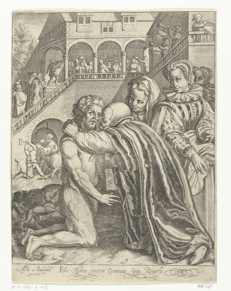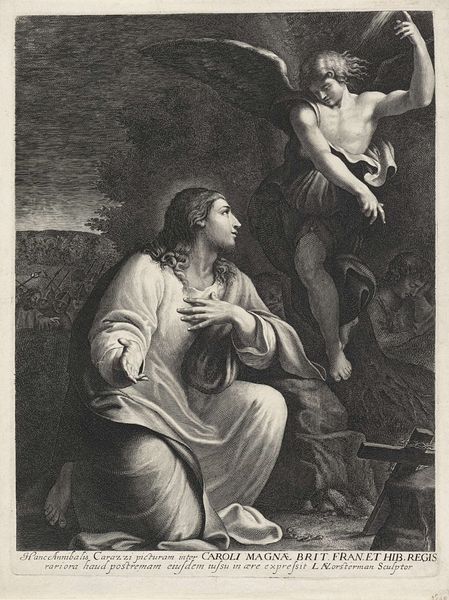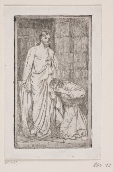 Curator: There's a deep hush to this piece, wouldn't you say? All shadows and hesitant light. It reminds me of stumbling into a confession. Editor: This is "Christ and the Doubting Thomas," an etching created around 1885 by Carl Bloch. What stands out to you about it as an object within its historical context? Curator: It's surprisingly intimate for a historical work dealing with faith. Usually, we see these grand, operatic portrayals, but here... it feels like a stolen moment between two souls wrestling with belief. It feels like doubt made visible, then tenderness rushing to meet it. Editor: Yes, the scale contributes to that feeling; etchings such as this circulated widely, available for individual study or devotion, influencing religious perceptions beyond the Church. Bloch’s works, distributed as prints, shaped popular understandings of scripture in the late 19th century. The distribution, that's the amazing part. Curator: Exactly! Thomas is almost overwhelmed. He's kneeling, his face buried in his hands, as though the reality of what he's seeing is too much to bear. But Christ's presence—softly radiant—isn't accusatory. It's an invitation, an understanding nod. What I want to know is why? How could this one make more relatable the feelings of those doubting back then? Editor: Bloch's emphasis on realistic representation and emotional engagement departed from more didactic, allegorical depictions common previously, reflecting a shift towards a more personal experience of religion aligned with social reforms in Danish society. Also, the choice to reproduce it by etching democratized access. The availability of the print medium ensured wider circulation than could be possible via large-scale paintings or drawings. Curator: Ah, that context enriches the quiet drama here. And the shadows—the heavy, enveloping shadows—add to that sense of being hidden, private, even vulnerable. Editor: It invites questioning—doubting—as a step in believing, aligning it with a modernized understanding of the gospels that served very progressive interests. Curator: Well, regardless, the artist left an enduring question on display. The art piece made me think: 'what proof will it take for me, today?'. Editor: Right. So perhaps it’s as much about Thomas's crisis of faith as it is about the socio-political conditions under which new modes of imaging and belief found circulation. A powerful, enduring reflection.