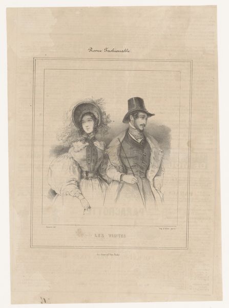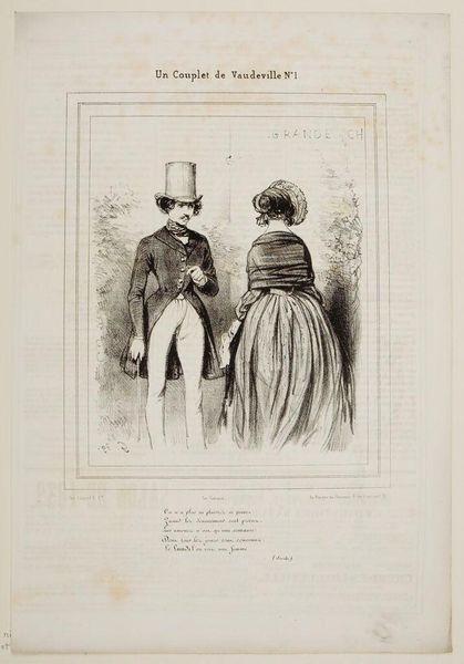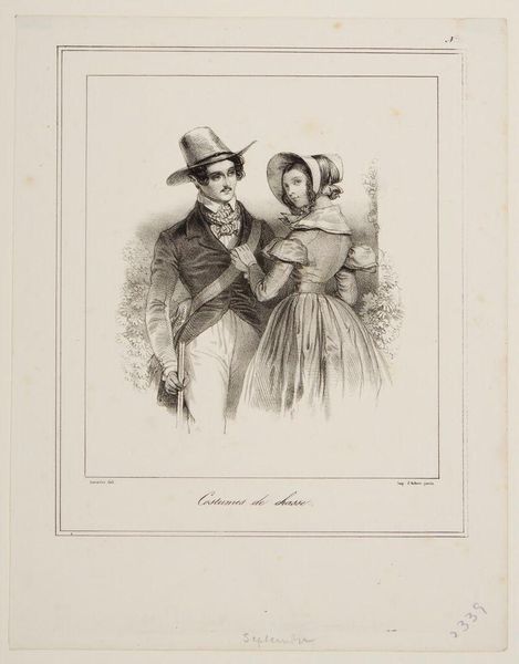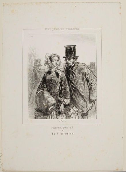 Curator: Paul Gavarni, born in 1804, created this drawing entitled, "Walking Suits". Editor: It's quite charming, a bit stiff, but the balance of light and shadow is very effective. Curator: Gavarni's lithographs often depict the daily life of Parisians. This piece speaks volumes about 19th-century fashion and social expectations. The suits themselves reflect the era's industrial production and consumer culture. Editor: The high contrast of the black ink against the paper creates a striking visual effect. Note how the artist used hatching and cross-hatching to define the forms of the clothing. Curator: Absolutely. The very act of walking and being seen in these clothes signified social status. The production and consumption cycles they represent are fascinating. Editor: I see that. It's a study in contrasts, formally capturing a moment in time. Curator: Indeed, quite insightful when considering Gavarni's sharp observation of social dynamics. Editor: A fleeting observation captured with masterful skill.