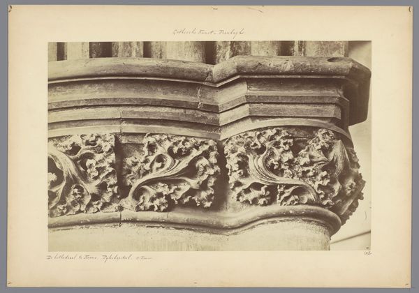 Editor: Here we have Gustave Eugène Chauffourier’s "Detail van de pandhof van de San Giovanni in Laterano in Rome," a daguerreotype from the late 19th century. It’s… well, it’s a wall. What am I missing? Curator: The material structure itself, Editor. Note the photographer's studied arrangement of geometric forms. We have squares, circles, diamonds--all presented in varying textural planes, united by shadow. What visual effect is achieved? Editor: A kind of rhythmic balance? But there's a tension, too, between the ornate details and the stark photographic medium. Curator: Precisely! Observe the upper register--the carved figures and foliage, anthropomorphic ornamentation placed above, juxtaposed with flat geometrical shapes. This stratification is echoed in the tonal values: the harsh sunlight emphasizing the decay and patina, yet somehow it also looks crisp. What is this communicating? Editor: I suppose that while the image is of a building detail, the artist wants us to consider something more than just architecture. Maybe, mortality or... time itself. Curator: Time is a crucial dimension in photographic analysis, specifically, how the formal elements are employed to articulate an ephemeral, almost intangible idea. Think of semiotics – how each element can act as a signifier pointing to a broader concept. Editor: It's interesting how limiting the subject to pure form can actually expand your understanding. I was stuck on it just being a building at first. Curator: Indeed, we started with the concrete but were able to transition to consider abstraction through close examination of visual arrangement and theoretical constructs. Editor: Now I see a dialogue of shapes and time.