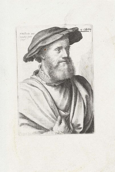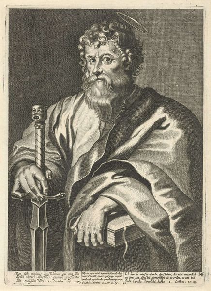 Curator: Standing before us, we have "Apostel Andreas," an engraving created between 1616 and 1636 attributed to Nicolaes Ryckmans, housed right here at the Rijksmuseum. Editor: My first impression? He seems like a world-weary traveler. The halo and the cross...well, those don't exactly scream 'easy life,' do they? The shading is interesting. The details seem quite...stark? It definitely looks to me like it's been rendered through engraving. Curator: Indeed. Notice how the artist employed line work to model form and texture? The density of the lines dictates tonal variations, a clever method. We could say, following formal analysis, that line becomes the defining structure here. Semiotic tools show his identity of Andreas to the Cross he embraces here. Editor: And how he clutches that cross! It isn't just an accessory; it's practically a part of him. It speaks volumes about commitment, and about the heavy burdens people choose to bear. Do you think it may have even caused the world-weariness I detected upon first seeing him? I wonder if it's the reason why his brow furrows so intensely? Curator: Perhaps. The baroque influence certainly adds dramatic weight. His gaze directs us outwards, engaging us as if in direct dialogue. Editor: He looks quite resigned, even stoic. What do you make of the lighting and the composition itself? Does the draping cloth communicate nobility in the work to you as it does to me? Curator: The relatively tight composition focuses our attention. Draping clothes give the Saint importance through the fabric falling perfectly over his torso and arm. A sense of dignity. While light is sparse, and the line gives a stark and unforgiving feel, its usage conveys, in many regards, the visual essence of baroque-era piety. Editor: For me, beyond technique and symbolism, it's about connection. Ryckman has managed to carve out—pun intended, perhaps—something deeply relatable about human perseverance from what otherwise may seem an icon frozen in time. Curator: It serves as a fine intersection between form, theme and emotional impact. Editor: I leave this interaction with a refreshed point-of-view. Nicolaes' Saint Andreas becomes an engaging embodiment of dedication against life's burdens.
