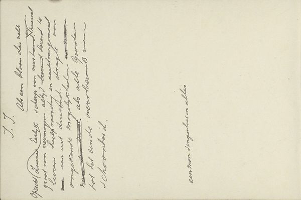Editor: This is "Annotaties," a drawing in ink on paper, by George Hendrik Breitner, made around 1886 to 1890. The aging of the paper and fading of the ink give the piece a fragile, ephemeral quality. What do you see when you look at it? Curator: The focus here is undeniably on the materiality of the work itself. The aged paper and faded ink are not just aesthetic qualities but reveal the passage of time and the decay inherent in material existence. It also speaks to the labour involved – the act of writing, of inscription, almost lost to time. We’re left with traces. Are these annotations a commodity? Is this art, or simply ephemera? Editor: So the artistic value comes not from a depicted subject, but rather the tangible elements and the creation itself? Curator: Precisely. The hand lettering becomes a critical focal point. Consider the means of production. It challenges our traditional ideas of "high art." What does Breitner, in using humble materials like paper and ink, tell us about the accessibility or the perceived value of artistic expression? And who was this made for? Editor: That's an interesting way to put it – making us question what defines art itself based on how it’s made. Curator: The means by which art is made, and how these relate to society’s power structures are paramount. Think of it this way, what labor and social context created this object we consider worthy of display now? Editor: I guess it makes you realize art isn't just about pretty pictures; it's tied to real materials, processes, and ideas around value and labor. Thanks! Curator: Absolutely, it's in understanding those connections that we can truly appreciate the richness and complexity of art.