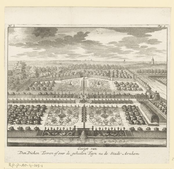 Pieter Schenk created this print, "Gezicht vanuit Huis de Voorst op de stal, de kleine tuin en Deventer," around the turn of the 18th century. The work immediately strikes one with its highly ordered composition, presenting a garden viewed from an elevated position. The meticulous lines and geometric patterns impose a sense of control over nature, reflecting the formal garden designs popular during that era. Note how the receding perspective lines draw your eye toward the distant horizon and the city of Deventer. Schenk's engraving technique captures a remarkable level of detail, emphasizing texture and spatial relationships within the scene. The formal arrangement might be viewed through a structuralist lens as a symbol of societal structure, with the garden representing an ordered microcosm. The print invites us to consider how constructed landscapes reflect and reinforce specific cultural values and philosophical ideas about nature and society. Rather than offering a single, fixed reading, the artwork serves as a space for ongoing interpretation.