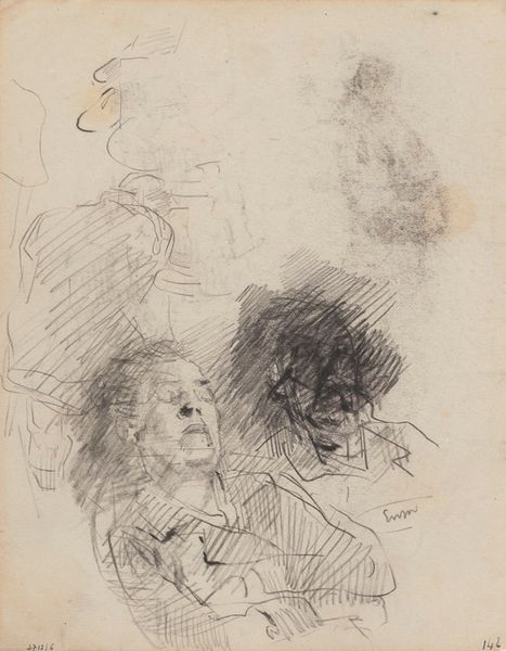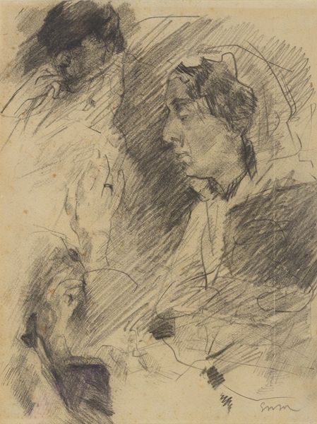 Editor: This is "Mother of Ensor, Hands and Foot," a pencil drawing from 1880 by James Ensor. It has this unfinished quality, a certain intimacy almost like glimpsing a private moment. How might we interpret this depiction of his mother through a historical lens? Curator: The intimacy you mention is key. Ensor’s choice of his mother as subject, depicted with such raw honesty, challenges the traditional, idealized portrayals of motherhood prevalent in 19th-century academic art. The work almost feels like a subversive act, dismantling public expectations about domestic life. Editor: So it’s pushing against the idea of motherhood presented by institutions at that time? Curator: Precisely! Consider the social context: the rise of bourgeois values, where the mother was positioned as the moral center of the home. Ensor's drawing subverts this. The sketchy lines and unconventional composition—focusing on her hands and foot as much as her face—convey a sense of unease, almost rebellion. The drawing becomes a form of social commentary, questioning the very foundations of the domestic sphere as constructed by societal expectations. How do you see this challenge reflected in the visual elements? Editor: The fragmented portrayal, the parts more than the whole, makes me feel like her identity extends beyond that idealized role. This was more insightful than I originally anticipated. Curator: Absolutely. It compels us to consider the power dynamics embedded within familial representation. The image highlights not just the identity of his mother but also raises crucial points about the status of domesticity at the time.