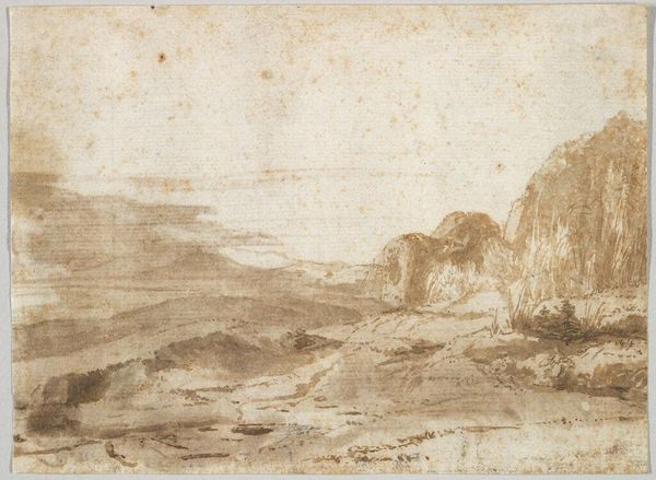 This landscape was made by Claude Lorrain, likely sometime in the mid-17th century, using ink on paper. The sepia ink and its application play a crucial role in creating depth and atmosphere, giving a sense of classical antiquity. Note how Lorrain varies his marks, from the delicate hatching on the distant hills to the broad washes defining the foreground. The ink is not just a medium for depicting the scene; it is integral to its emotional impact, creating a melancholic and reflective mood. Lorrain's technique reflects a highly skilled tradition, rooted in close observation and careful craftsmanship. The labor involved is evident in the precision and control of the ink washes, transforming the paper into a window onto an idealized world. Paying attention to the materials and processes used by Lorrain allows us to move beyond the image itself, and appreciate the artistry that brings this landscape to life.