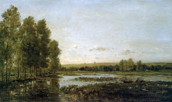 Editor: So, here we have Pierre Emmanuel Damoye’s "A Landscape with Cows" from 1881, created with oil paints, capturing a scene en plein-air. I’m immediately drawn to the texture; you can almost feel the dampness of the meadow. What's your perspective on this painting? Curator: It's interesting to consider this piece through a materialist lens, especially given its creation en plein-air. Consider the very act of transporting materials – canvas, easel, paints – to the site. It speaks to the artist's intent but also the accessibility of those materials. How does this method impact our understanding of the final product, compared to studio-based work? Editor: I hadn't thought about the labor involved in creating the work on site! Does the apparent "naturalness" of Impressionism sort of obscure the material realities that go into its making? Curator: Precisely. The consumption of landscapes, like this one, became popular alongside industrial growth. Wealthy consumers could afford paintings showing untouched nature. But where does the pigment come from? What about the production of the canvas? We need to unpack how these seemingly innocent landscapes are tied to broader economic systems. And of course, the lifestyle depicted: whose labour is making possible the seeming idyll of cows in a field? Editor: That’s a compelling perspective! It pushes me to think about what the landscape represents for different social classes during that era. Curator: Right. We must question who gets to enjoy and consume these images and how their value shifts depending on social contexts. How does seeing the work as a commodity change our relationship to it? Editor: I think looking at art through a materialist lens helps ground these seemingly ethereal landscapes. I’ll definitely be researching the pigment trade and the art market during the Impressionist era now! Curator: Excellent. It’s a way of connecting the art to a tangible social reality, rather than seeing it as merely an aesthetic object.