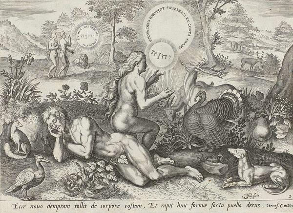 Curator: This is Johann Sadeler’s "The Creation of Adam," made circa 1589. Look at the sheer density of the engraving! Editor: It feels crowded, almost claustrophobic, despite the open landscape. Is this the artist’s interpretation of abundance? Curator: Abundance, perhaps, but also hierarchy. Note how Adam, centrally located, receives divine light, while the animals are relegated to the periphery. Editor: And that serpent slithering in the foreground! A clear symbol of temptation and the fall, disrupting the harmony with its sinister presence. Curator: Precisely. The composition’s strength lies in contrasting the idealized human form with the natural, yet morally ambiguous, world. Editor: It’s a powerful reminder of humanity’s precarious position between the sacred and the profane. Curator: Indeed, a potent visual exploration of creation and its discontents. Editor: Definitely a piece that invites layers of interpretation.