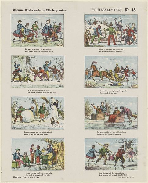 Editor: This lithograph, titled "Middelen van Vervoer," or "Means of Transport," is attributed to Jan de Haan, created sometime between 1875 and 1903. It features a series of vignettes showcasing various modes of transportation. The scenes remind me of a children's storybook page. What strikes you most about its composition? Curator: Its arrangement of disparate scenes within a single plane is particularly notable. We are invited to scan, compare, and contrast these separate blocks as individual fields and as elements of an integrated field. Observe the contrast in perspective and the handling of light. The artist manipulates spatial depth, creating tension between flatness and recession. Do you find this juxtaposition effective? Editor: Yes, it does draw my eye across the page, comparing each method of transportation. I notice the rough quality of lines that create a sort of rhythm across the scenes, contrasting straight and jagged textures. Curator: Precisely. The crude lines contribute to a unified field; yet this field lacks traditional harmony, which leads to an active viewing as the observer grapples with resolving visual conflicts. Moreover, notice how the lithographic medium, with its inherent qualities, underscores the work’s intended dissemination, thus prioritizing accessibility over idealized perfection. Editor: So, it’s not just about depicting transport, but also about how the medium and composition create a unique viewing experience? Curator: Indeed. The success lies in its orchestration of these formal qualities—line, composition, and medium—into a field ripe for investigation and decoding based on its intrinsic value as an art object. Editor: I see it now, it’s about more than just modes of transport; it is the composition and technique creating a viewing experience and emphasizing the printing technique for distribution and accessibility to wider audience. Thank you.