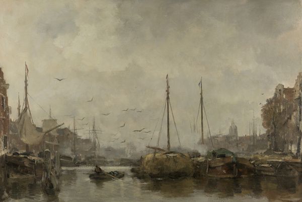 Jacob Maris painted this Harbor View with oil on canvas, using techniques that, at the time, were becoming increasingly standardized and widespread. Oil paint allows for layering and blending, evident in the atmospheric haze and the soft reflections on the water. Maris applied the paint with loose brushwork, capturing a sense of movement and the transient nature of light. The muted palette, dominated by grays and browns, suggests a somber, industrial harbor scene. Consider the social context: Dutch harbors were busy centers of trade and labor. Maris doesn't depict the ships in pristine condition, but rather conveys a sense of their daily wear and tear. The artist’s attention to the working environment highlights the connection between labor, trade, and the environment. By focusing on the materiality and the context of production, we can appreciate how Maris elevates a scene of everyday labor into a work of art.