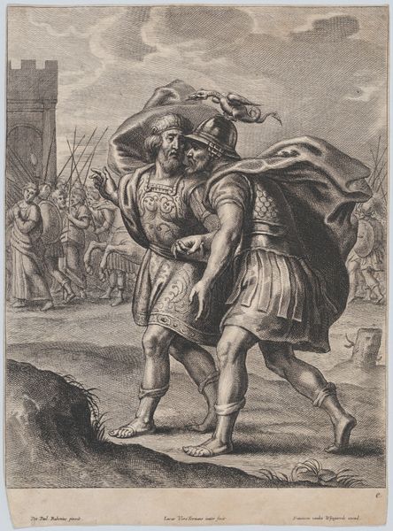 Giulio Bonasone created this engraving, Heilige Rochus, in the 16th century, and it's now held at the Rijksmuseum. The composition immediately presents a central figure rendered with meticulous detail, set against a more loosely defined landscape backdrop. The engraving’s formal structure hinges on a contrast between the detailed rendering of St. Roch and the softer treatment of the background. Bonasone uses line work to articulate form, with the density and direction of the lines defining the contours and textures of the saint's body and garments. The formal arrangement invites a semiotic reading: the saint, with his symbolic staff and the revealing bubo on his leg, stands as a signifier of faith and resilience. The architectural elements in the background, barely delineated, act as a visual counterpoint, suggesting a world from which the saint is both a part of and apart from. Ultimately, Bonasone's formal choices serve to elevate the thematic content, transforming the material reality into an essay on belief and transcendence.