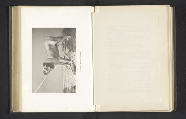 This is an anonymous photograph of a bulldog. It appears to be one page in a book. The image, rendered in grayscale, presents a composition that is as unsettling as it is intriguing. The dog, with its muscular build and a dark band covering its eyes, stands perpendicular to a wall. Its forelimbs are unnaturally extended, almost as if it is being crucified. The composition is stark, using the tonal range to emphasize the texture of the dog's skin and the subtle patterns on the wall behind it. This setup destabilizes our expectations of photographic portraiture. The photograph could be a commentary on control and visibility, the obscuring of sight ironically brings attention to the power dynamics at play. The dog becomes a signifier, caught between nature and culture, challenging fixed meanings. Note how the vertical lines of the wall contrast with the horizontal extension of the dog's limbs. It creates a tension that is both formal and thematic. The photograph invites us to decode its visual components and cultural codes, it acts as an invitation to ongoing interpretation.