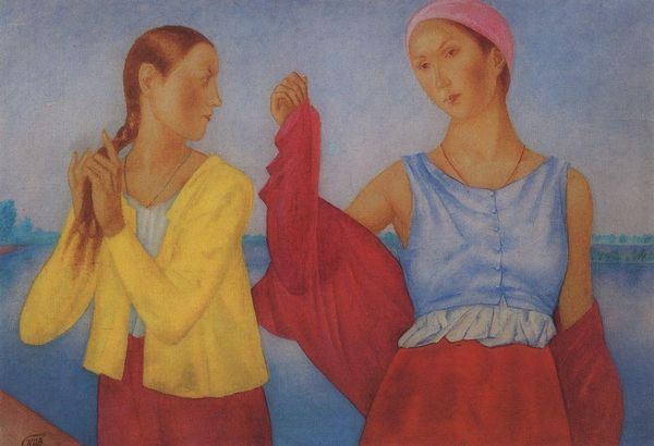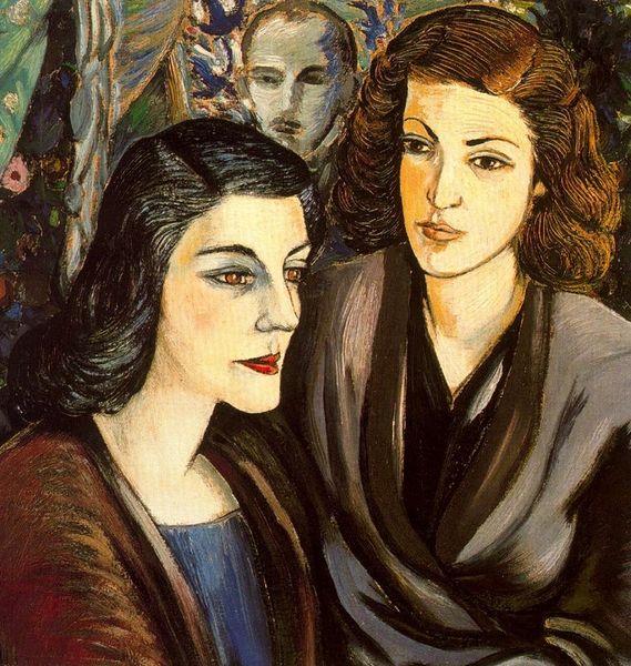 Curator: Tsuguharu Foujita’s oil painting "Two Women," completed in 1918, presents an intriguing composition. What strikes you initially about it? Editor: There's a profound melancholy. The paleness of their skin, the subdued ochre tones of their dresses against that washed-out background...it all speaks of quiet resignation, or perhaps quiet defiance. Curator: Foujita was working in Paris during the First World War. His proximity to avant-garde circles certainly influenced his evolving artistic vision. He experienced first-hand the influx of new ideas circulating within Montparnasse's burgeoning art scene. Editor: And did these women represent a particular class? Or perhaps stand as commentary on wartime austerity? Their somber mood, the flower pinned on the left figure’s dress – is it an act of defiance? Does this offer us a glimpse into the socio-political atmosphere of the time? Curator: Perhaps, but let's consider also that Foujita incorporated very distinctive Japanese aesthetic elements with western modernism. Notice, for example, their elongated features and graceful poses. These are clear references to traditional Japanese portraiture. And then their placement suggests intimacy; they share a single red seat, yet don't quite make eye contact. Editor: That very sense of isolation amid connection is palpable. This piece engages themes of intimacy and alienation, reflecting the complex dynamics between women navigating societal expectations and personal desires during a pivotal era. One almost feels an encroaching sense of voyeurism looking at them in such an exposed space. Curator: Yes, by embedding this intimacy, Foujita offers the audience not only aesthetic pleasure but an intimate insight into a shared quiet moment of existence, which serves as a reminder of the intricate relationship between private emotions and the broad public impact of events. Editor: "Two Women" transcends a mere double portrait. It becomes a cultural artifact, reflecting not only the artist’s identity but the profound intersectionality of the world at that time. Curator: Indeed, and looking at the historical record alongside these aesthetic dimensions offers valuable insight to understanding the development of art itself during such transformative years.