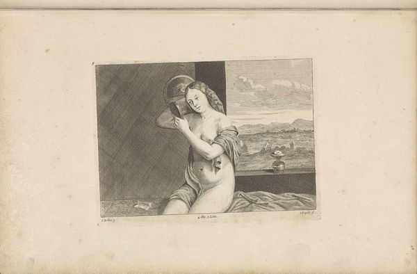 Editor: This is Fantin-Latour's "Venus and Cupid," held at the Harvard Art Museums. It feels very dreamlike. What do you notice about the composition of this piece? Curator: The formal elements reveal a study in contrasting textures. Observe the smoothness of Venus' skin juxtaposed against the rough, almost chaotic, strokes defining the foliage and the hay she reclines upon. Editor: So, the contrast creates visual interest and depth? Curator: Precisely. The interplay of light and shadow, rendered through delicate etching, constructs volume. Consider how the artist uses line to define form and differentiate textures. An intentional choice, wouldn't you agree? Editor: Yes, it really brings the figures to life. I'll definitely be thinking about texture more.