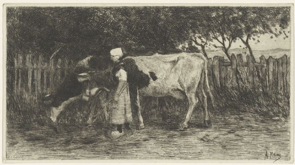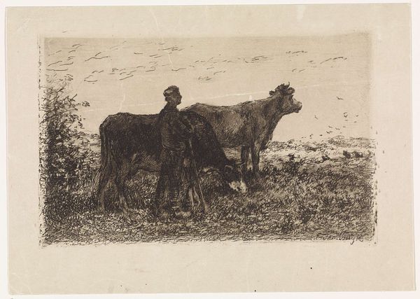 Curator: This drawing, rendered in pencil, depicts "Boer tussen twee koeien bij een ruif in een stal (grote variant)," translating to "Farmer between two cows by a manger in a stable (large variant)." The artist is Jan Vrolijk, and we estimate its creation between 1860 and 1885. What is your first impression? Editor: Claustrophobic. Despite the open-air feel of a farm, the density of the pencil strokes, the dark values—they make the composition feel closed in, almost stifling. Curator: The cross-hatching undeniably builds a significant tonal density, creating substantial areas of shadow. Consider how Vrolijk uses this technique. He carefully modulates pressure, giving form and volume to the cows and the farmer himself. Look how light barely touches the edges. Editor: Exactly. These areas of deep shadow around the edges and behind the figures lend a sense of foreboding. It reminds me of the "Dark Ages" imagery, you know? The symbolism of agriculture and rural life takes on a somber tone. A man stands passively with these animals; it speaks to a specific relationship. Curator: Symbolism aside, let's note the structural choices. Vrolijk confines our view with the stable walls and the looming presence of the larger cow on the left. Even the downward gaze of the cow at right creates an almost triangular composition pointing to a single point of emotional gravity: the reliance between man and beast. Editor: Yes, the weight. The heaviness is unavoidable. Notice also the placement of the milk jug at the base of the drawing. Milk is the primary offering these creatures give the farmer. A source of nutrition and a symbolic link between humans and nature... and a transaction with implied obligation, right? Curator: Indeed. Vrolijk successfully intertwines formal structure with elements suggestive of a life of labor and agricultural dependence, an inescapable relationship defined by the period. Editor: So it is both visually compressing and historically weighted... Food for thought indeed.