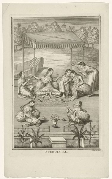 Editor: We're looking at "Two Women Around a Table Near a Country House" by Jan Punt, created in 1742. It's an engraving. There's so much activity, it feels busy. How would you interpret this work? Curator: The dynamism in this work emerges not just from the density of figures, but from the calculated arrangement of forms. Consider the visual progression from the lower-left corner, with its stacked brickwork and cascading fountain, upwards and across to the swirling foliage, before our eye settles on the precisely draped figures around the table. Note how the linear precision of the engraving technique serves to delineate each element, giving each equal value in the overall composition. What effect does the interplay of orthogonal and organic lines create in your understanding of the artwork? Editor: I see what you mean, it does keep my eye moving around the composition. So it's less about what the people are doing and more about how all the parts fit together? Curator: Precisely. The 'narrative,' if one can call it that, serves primarily as a framework. Focus on how the lines create balance in the composition, notice the mirroring between architectural structure and vegetation, the stark tonality between light and shadow. Are these visual clues merely decorative, or could there be deeper meaning constructed from these purely formal structures? Editor: That's a fascinating way to look at it. I hadn’t really considered just focusing on how it all works together visually like that. It feels less intimidating, actually. Curator: Indeed. Reducing our analysis to fundamental structures grants us direct access to a structured organization. Focusing on those parts is a reliable strategy.