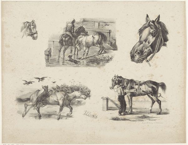 Editor: This is "Four Depictions of Horses and Cows" by Victor Adam, dating from around 1830 to 1840. It's a lithograph— a print— with both pencil and pen sketches of farm life. I'm struck by how grounded and perhaps even a bit romanticized it feels. What historical context shapes our understanding of this piece? Curator: It's fascinating to consider this lithograph through the lens of early 19th-century industrialization and urbanization. As cities grew and technology advanced, Romanticism, to which it belongs, often looked back to an idealized, agrarian past. How do you see that tension reflected in Adam's depiction of these animals? Editor: I see what you mean! The way the animals are portrayed seems very…gentle, almost posed. It’s not really gritty farm work but more like idealized portraits of rural life. Curator: Exactly. And it’s important to remember the audience. Who was buying and viewing these prints? The rising middle class, perhaps, who may have been increasingly disconnected from agricultural realities. How does that disconnect inform our interpretation? Editor: So, the print could be viewed as reinforcing certain class distinctions, where the idealized image of rural life becomes a commodity for those distanced from it. Curator: Precisely. Consider how artistic representation, even in seemingly simple depictions, contributes to larger socio-economic narratives and reinforces power structures. Editor: I see how seemingly straightforward depictions can mask complex social dynamics and biases. This print offers more than just a glimpse into farm life, it holds up a mirror to the evolving social structure of that era. Curator: Absolutely! Examining art through these intersections reveals the silent dialogues it holds with society. Editor: That's given me so much to think about, thank you!