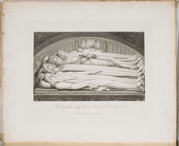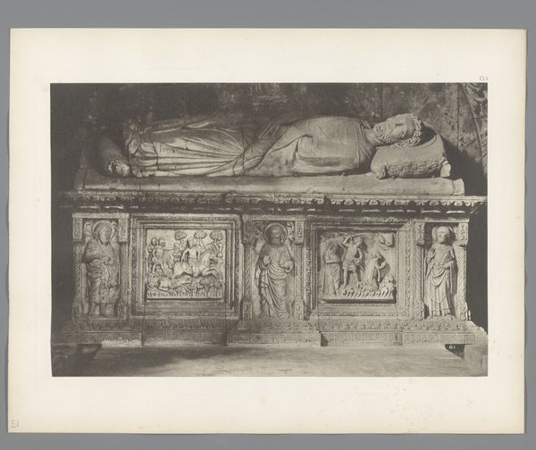 Curator: This evocative gelatin-silver print, produced sometime between 1850 and 1900 by M. Frankenstein & Co., depicts “The Tomb of Emperor Leopold II in the Capuchin Crypt in Vienna.” It presents a staged photograph within this historically significant burial site. Editor: Gosh, talk about heavy. You can practically feel the weight of the stone and the oppressive silence in the crypt. That figure draped in white looks like a ghost herself. Curator: Indeed. Consider the piece in its temporal context. The late 19th century witnessed heightened interest in royal legacies and the consolidation of national identities. Photographs like these weren't just records, they actively shaped perceptions of power and mourning rituals. The photograph aestheticizes Leopold's resting place but also, I think, the idea of the Habsburg monarchy. Editor: Right. I keep coming back to that shrouded figure. It looks like a mourning vestal virgin or something. Dramatic, I mean, but also...slightly artificial, staged for the camera. Is it playing at sincerity, or is it really grief? Curator: I'd argue both are present. The photographic process then allowed for carefully constructed imagery, lending itself well to reinforcing particular narratives around rulers, empires, and historical trauma. Grief is deeply embedded in systems of gender and power, and even performative mourning speaks volumes. Editor: All this is fascinating. And kind of heartbreaking when I think of what's going on in our own time now, still the same kinds of performances and the same griefs over and over. Curator: Photography often serves to memorialize what we're afraid to forget. It compels ongoing considerations around power and its consequences. Editor: Makes me think we’ll be having this same conversation, generations from now, only with a different set of images. Okay, heavy but hopeful. Let’s move on.